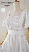 胸のシャーリングとふんだんに使ったギャザーフリルがポイント。